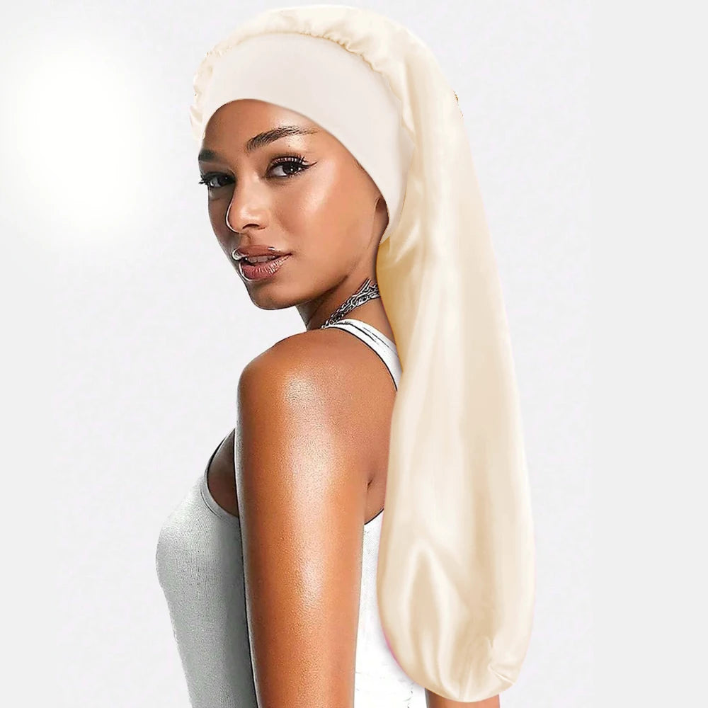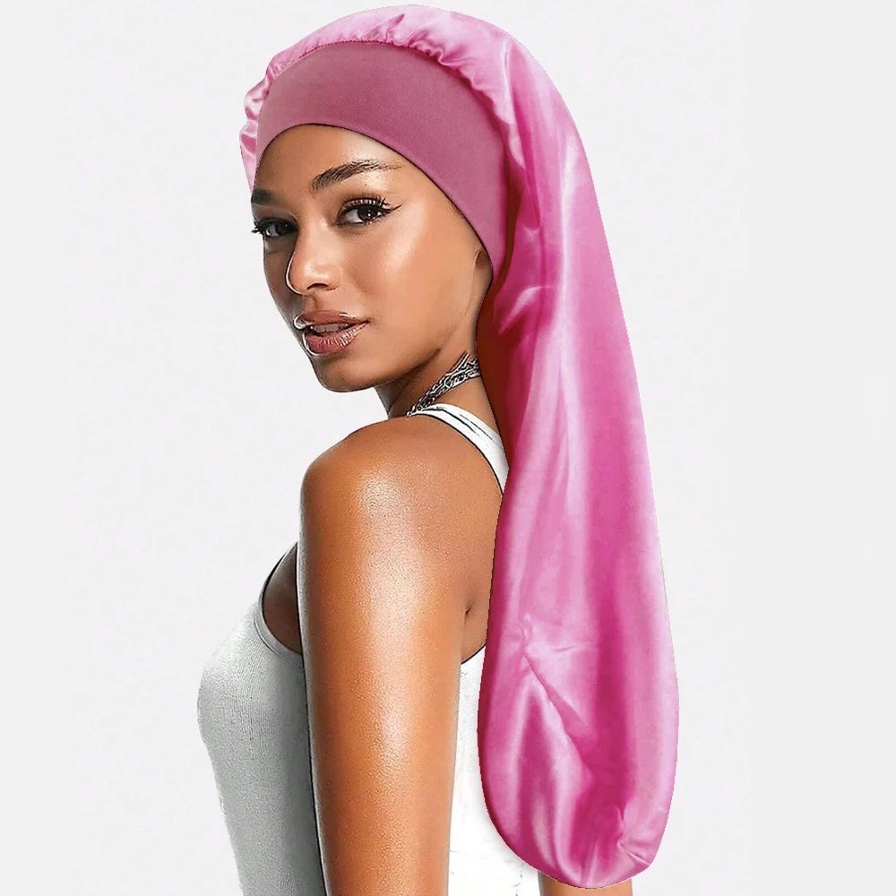 Ce bonnet en satin long est un bonnet de nuit en satin conçu pour les cheveux longs, les tresses et les locks, proposé en plusieurs couleurs (crème, rose, noir, brun).
